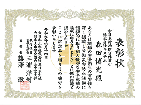 2019年6月14日に開催された、大日本土木株式会社様の安全協力会・安全衛生大会において、森田博光警備員および当社が表彰されました。